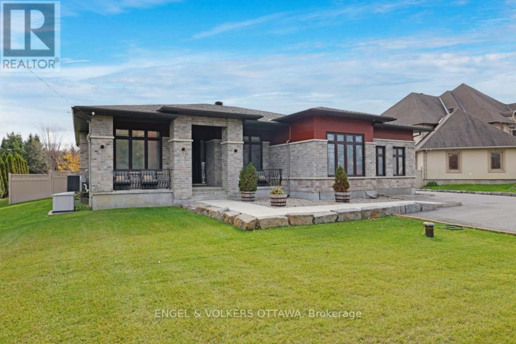 Live your Luxury in Manotick! Crafted by Woodstruct Construction in 2018, this custom bungalow harmonizes quality design, refined finishes and a perfected layout for daily living and sophisticated entertaining. Expect to be wowed by the exquisite detail and workmanship - 10 ft ceilings, natural maple & walnut accents, stunning hardwood flooring and the expansive south-facing windows where the sunlight pours in throughout the day. A showpiece kitchen with quartz counters, a statement island, walk-in pantry, and Bosch suite (gas cooktop, oven, convection oven/microwave, dishwasher) finished with USB outlets and reverse-osmosis water. Relax in the serene primary retreat with dual walk-ins and a spa-level 5-piece ensuite. Four of the five bedrooms enjoy private ensuites; a fifth bedroom flexes as an office, den or organized storage room. Downstairs, a thoughtfully finished, apartment-style level-also accessible from the insulated two-car garage supports multi-generational living with a gym, living and dining areas, office, theatre room and a wet bar rough-in.The backyard living space offers a low-maintenance irrigated yard. Perfect for entertaining in the large gazebo, the oversized solarium, or hot tub; the fenced lot and trees allow for privacy with minimal neighbouring presence. ENERGY STAR heating/cooling/water with Wi-Fi controls, triple-pane front windows, manifold plumbing with individual shut-offs, UV water treatment with softener/iron, high-end two-bed septic, generator with automatic transfer switch, EV outlet, built-in speakers and digital alarm. Eight-foot solid-core Cambridge doors, crown/baseboard and window trim. Minutes to Manotick Village and Hwy 416 with an easy commute to downtown-perfect for the buyer who values craftsmanship, luxury, and design. (id:52350)