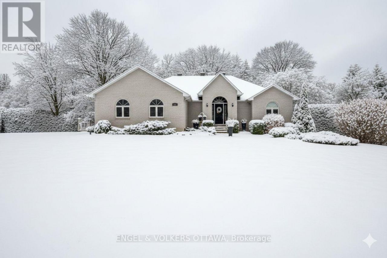 1591 Stephanie Anne Drive invites you to enjoy luxurious living on a peaceful, treed corner lot surrounded by manicured 20-foot hedges for privacy and set back from the road in one of Greely's most established and coveted communities. The main floor opens with a grand foyer boasting vaulted ceilings, ceramic tile and gleaming hardwood floors. Anchored by a gas fireplace with soaring 13-foot ceilings, the living room exudes warmth and grandeur, while the separate dining room sets the stage for memorable gatherings. The spacious designer kitchen is perfect for hosting and features quartz counters, stainless steel appliances, and a large central island with seating. A bright adjoining eating area with oversized windows extends to a private backyard and two-level hardscape patios, perfect for morning coffee or evening relaxation. The primary suite offers a walk-in closet, additional wardrobes, and a luxurious 5-piece ensuite. A spacious secondary bedroom and beautifully finished full bath with striking shower tile complete the main level. (3 bathrooms include quartz counters). A striking circular staircase leads to the lower level, where the soundproof theatre takes centre stage with two-level seating and cinematic scale. Complementing this is an expansive recreation room with a center gas fireplace and an area that can easily accommodate a fourth bedroom. An additional bedroom (currently being used as a gym) with a wall-to-wall closet, a home office, a sleek full bath, and a laundry room round out this spacious lower level. This custom home, crafted with enduring steel construction, sweeping circular 21 vehicle driveway to the oversized two-car garage, and underground irrigation system impress across the manicured property, while the large custom storage shed offers unmatched convenience. Minutes from schools, parks, shops, and nature trails. This home delivers Greely's tranquility with modern luxury and unforgettable entertainment at home with family and friends. (id:52350)