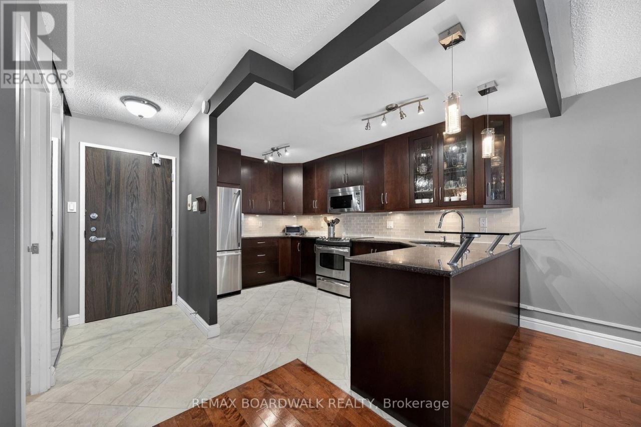 Welcome to this bright and stylish 1-bedroom condo, perfect for first-time buyers, investors or downsizers. Featuring an open-concept layout with beautiful hardwood flooring throughout, this unit offers both comfort and functionality. The updated kitchen is equipped with stainless steel appliances, granite counter tops plus breakfast bar, which flows seamlessly into the living and dining area-ideal for everyday living and entertaining. The renovated bathroom adds a modern touch, while the private balcony provides a great space to relax and unwind. Conveniently located with laundry just across the hall, this unit also includes one indoor parking space, a storage locker & 2 air conditioners. Enjoy easy commuting with the Smyth bus station directly across the street. Residents also have access to excellent building amenities including an indoor pool, sauna, party room, fenced in dog walking area, car wash area, library, games room, weight & aerobics room plus guest suite. A fantastic opportunity to own a superior move-in-ready condo in a convenient location! (id:52350)