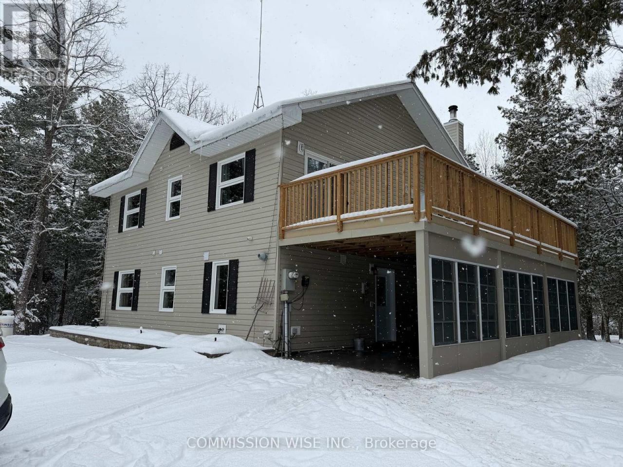 This distinctive two-storey residence is set on 11.30 private acres, surrounded by mature trees that provide exceptional privacy and a tranquil natural setting. The property features an attached carport and a two-car detached insulated and heated garage with loft space currently used as a gym and workshop, along with a woodshed, storage shed, and greenhouse. The main level offers a family room, a primary bedroom with walk-in closet and walkout to the backyard, a den, and a four-piece bathroom. The upper level serves as the principal living space, featuring a bright open-concept layout with kitchen, living area, two bedrooms, a four-piece bathroom, and a spacious 30' x 12' deck overlooking the grounds. Interior finishes include hardwood and tile flooring, modern décor, hot water radiant heating, and a wood stove. Numerous updates have been completed, including interior painting (2026), windows (2025), upper deck (2025), steel roof (2020), boiler and water heater (2021), granite countertops (2019), wood stairs (2020), and wood stove (2019). Additional structures include a sunroom (12' x 10'), carport (11'7 x 21'6, 2016), two-car garage with loft (28' x 25', 2011), woodshed (16' x 16', 2012), and garden shed (8' x 8', 2012). Walking trails through Morris Island Conservation area right across the road. Also the ATV and snowmobile trails that cross the Ottawa River to Quebec is a short walk away. This property is well suited for buyers seeking privacy, versatility, and a peaceful wooded environment. (id:52350)