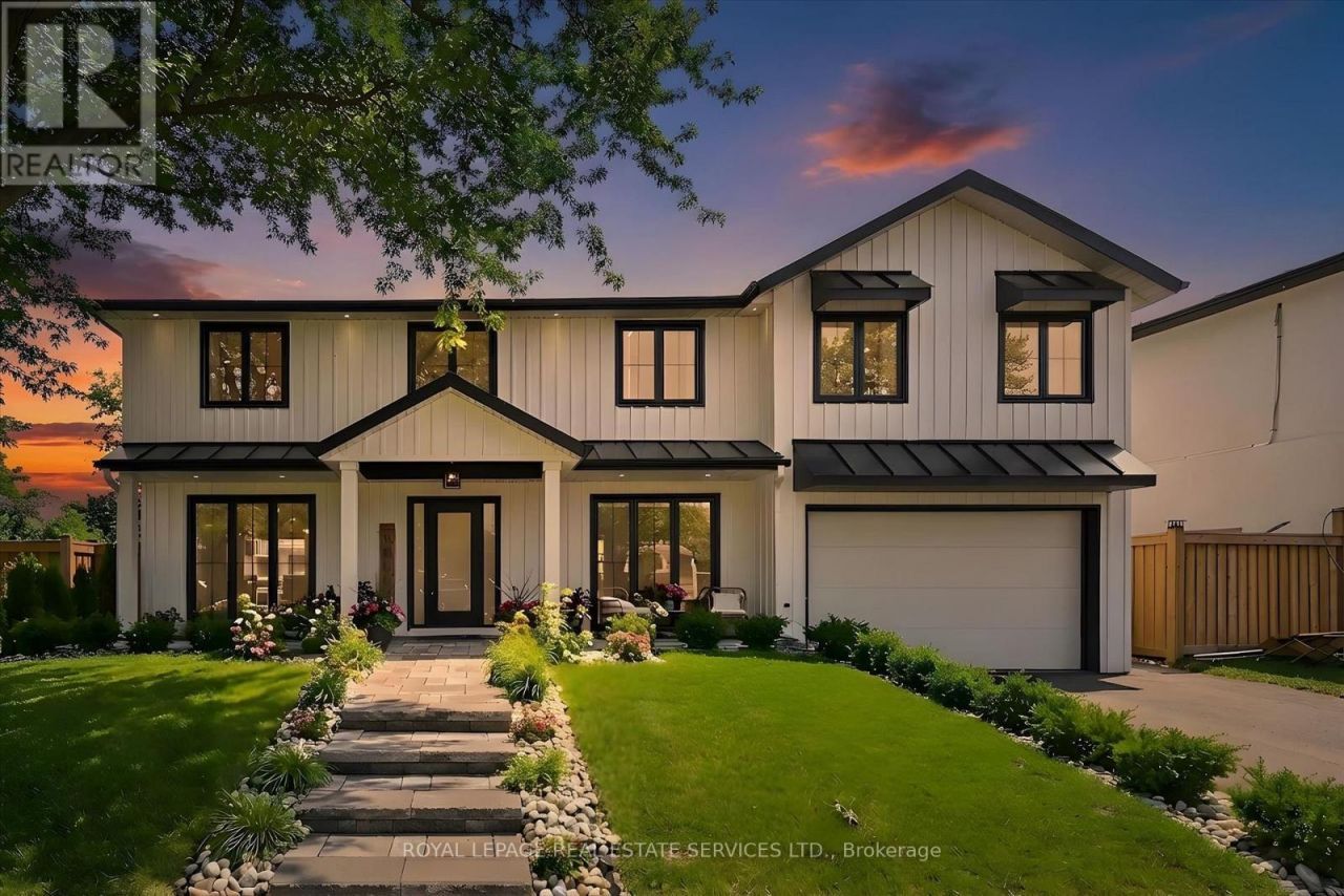 Recently reimagined for modern family living, this West Oakville residence blends refined architectural design with a resort-style backyard retreat, all just minutes from the lake. Offering 4+1 bedrooms, 4.5 bathrooms, and a finished lower level, the home delivers a seamless balance of style, comfort, and functionality. The main level is defined by engineered hardwood flooring, expansive floor-to-ceiling windows, and open-concept principal rooms designed for everyday living and entertaining. The custom kitchen showcases quartz countertops, a large centre island with sink, JennAir gas range, pot filler, and effortless flow to the backyard. An open-riser staircase with glass panels adds architectural interest, while the living area is anchored by a feature wall with gas fireplace. Upstairs, engineered hardwood flooring continues throughout. The primary suite offers an accent wall, wall sconces, a walk-in closet with built-ins and window, and a spa-inspired ensuite featuring a freestanding tub, glass shower with rainfall showerhead, and double sinks. A second bedroom enjoys its own private three-piece ensuite, while two additional bedrooms share a well-appointed four-piece bath. A convenient laundry room with sink completes the upper level. Outdoors, the fully fenced backyard is a true showpiece. Designed for entertaining and relaxation, it features an inground pool with an eco-friendly and cost-effective copper ionizer system, extensive stone hardscaping, and a covered outdoor living area with gas fireplace. A dedicated BBQ area with gas line and direct side-door access to the kitchen enhances both convenience and functionality. Ideally situated near parks, Gladys Speers Public School, St. Dominic Catholic Elementary School, Queen Elizabeth Park Community and Cultural Centre, shopping, transit, major highways, and the lake, this home offers an exceptional lifestyle in a vibrant, family-friendly community. (certain exterior images have been digitally enhanced) (id:52350)
