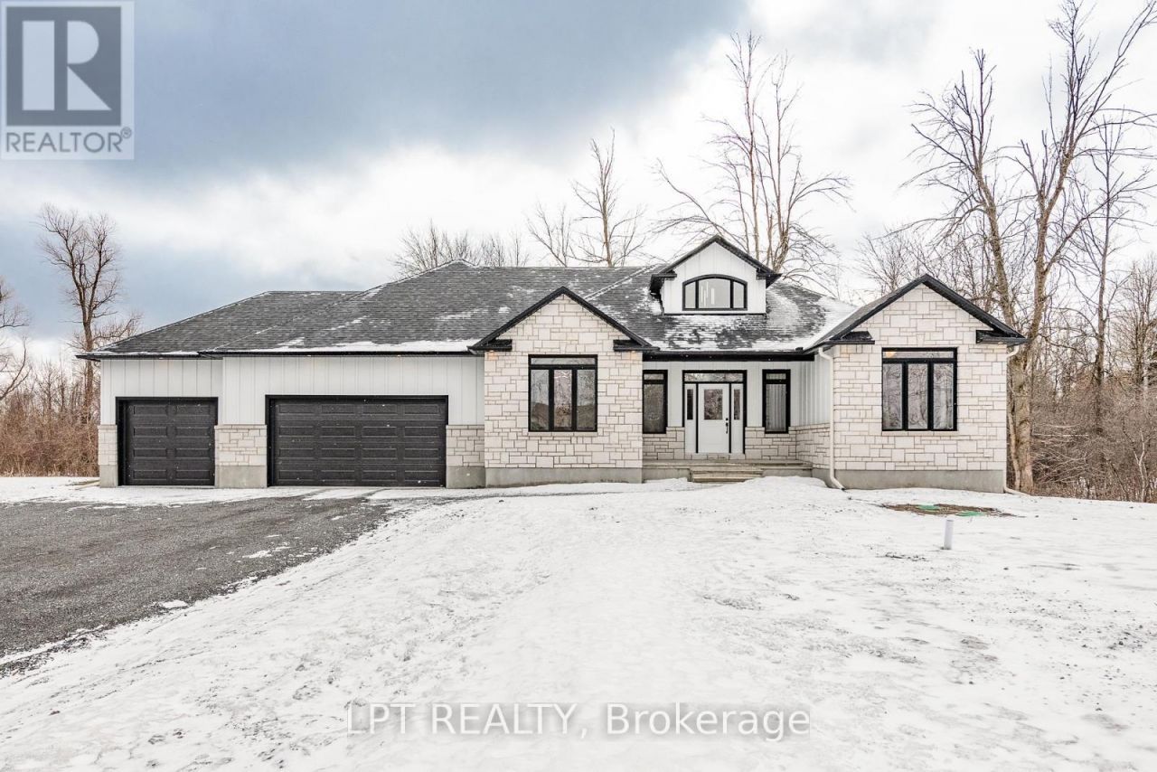 A statement of modern luxury set on over 2 acres. This custom-built bungalow offers exceptional design, soaring spaces, and endless potential with an unfinished walkout basement ready for your vision. The thoughtfully designed layout features 3 generous bedrooms, including a private primary retreat set on its own wing with a spa-like ensuite and expansive walk-in closet. The main living area impresses with 9' ceilings and a stunning family room highlighted by a 12' vaulted ceiling. A dramatic front foyer welcomes you with an impressive 19' ceiling height, setting the tone for the home's grand scale. The chef-inspired kitchen is built for entertaining, anchored by a striking quartz waterfall island and walk-in pantry. Complete with an oversized 3-car garage, this property offers the perfect balance of luxury, privacy, and space just minutes from Ottawa. (id:52350)
