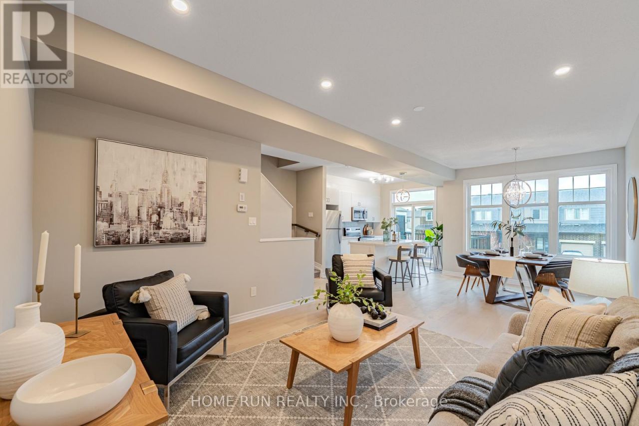 Open House 2-4PM, Sunday, April 5. Welcome to a well-designed and beautifully upgraded 3-storey townhome in Minto's Harmony community in Barrhaven! The south-facing orientation fills the home with natural light throughout the day. The ground floor features a spacious foyer with access to an extra-deep single-car garage, and a conveniently located laundry room - situated away from the upper bedrooms for a quieter living experience. The open-concept second floor is bright and welcoming, with 2.74 m ceilings, large windows and a thoughtful layout connecting the living room, dining area, and kitchen. The modern kitchen is finished with high-end Calacatta Gold quartz countertops, a tiled backsplash, stainless steel appliances, a deep upper cabinet above the fridge, and a full gable panel beside the fridge - a clean, polished look throughout. The kitchen flows into the dining area and opens onto a south-facing balcony, ideal for outdoor relaxation. Wide plank 19 cm engineered hardwood flooring and upgraded light fixtures are found throughout the second and third levels. On the third floor, the primary bedroom features a spacious walk-in closet and a private door directly to the main bathroom - a thoughtful upgrade for added privacy and convenience. A well-sized second bedroom comfortably fits a queen bed and serves equally well as a guest room or home office. Conveniently located close to Barrhaven Centre (4 min), Costco (7 min), Walter Baker Sports Centre (6 min), and HWY 416 (7 min), with nearby access to a public French secondary school and Ottawa Christian School. (id:52350)