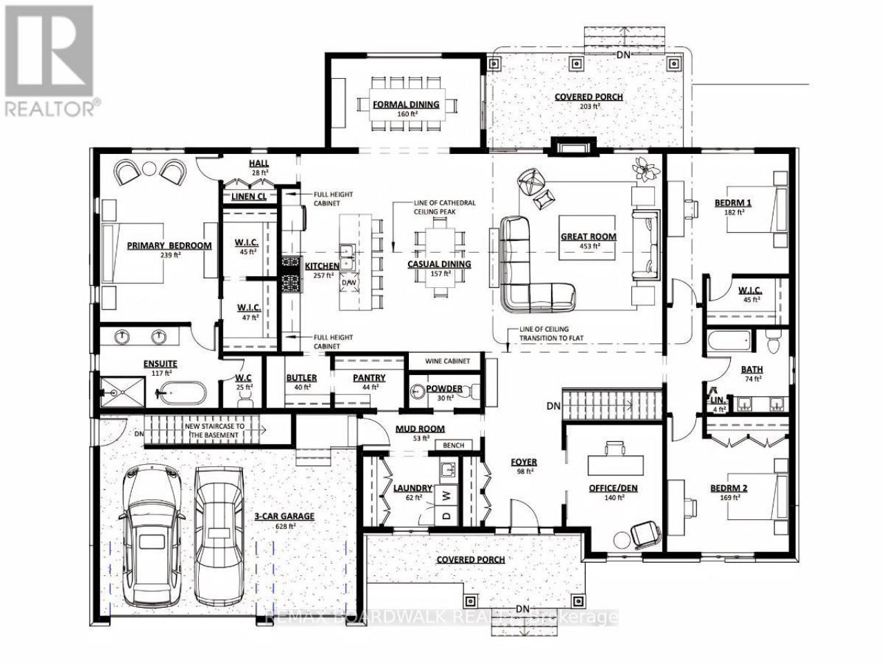 Designed by Zanmar Homes, this custom-built 2,918 sq ft bungalow blends luxury with thoughtful design. The main floor features 3 bedrooms and 3 bathrooms, plus a bright home office with a glass wall and door, while the primary bedroom enjoys its own private wing complete with his and hers walk-in closet and a 5-piece ensuite bath. On the opposite side of the home, bedrooms 2 and 3 share a 5-piece bathroom, while bedroom 2 offers a walk-in closet. The great room boasts 18 ft cathedral ceilings and a stone fireplace, and the extended formal dining room opens directly to the covered porch, making it perfect for entertaining. Enjoy 9 ft ceilings, engineered hardwood flooring, 8 ft solid core doors, an upgraded fibreglass front door, and modern black interior and exterior windows with grills. The mudroom off the garage offers pantry access for ultimate convenience. The basement has a separate entrance, ideal for an in-law suite, with the option to finish for additional living space. Ready for occupancy this June, there's still time to personalize the floor plan with trusted Tarion Certified homebuilders. *Interior photos are from previous builds. (id:52350)
