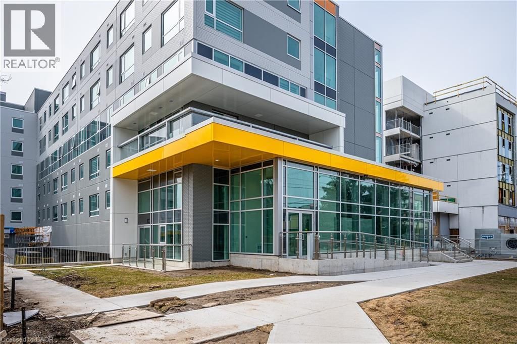 Prime Commercial Lease in the Heart of Waterloo, Steps to University of Waterloo and Wilfrid Laurier University, this high-exposure unit is surrounded by dense residential buildings, offering constant foot traffic and excellent accessibility. Fully finished loft-style space featuring a main floor with kitchen, bathroom, and laundry, plus a bright open area with impressive two-storey ceilings. Floor-to-ceiling front windows provide outstanding visibility and signage opportunities. Modern glass staircase leads to upper-level office space with powder room and direct building access. Enjoy access to in-building amenities. Ideal for businesses seeking visibility in a prime, high-traffic location. (id:52350)