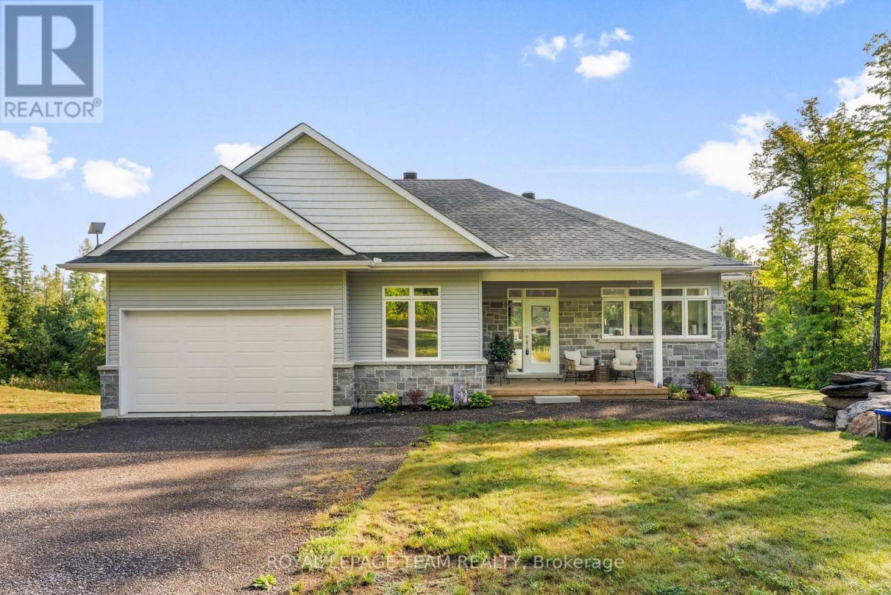 Located in the desirable community of Calabogie, just steps from the Calabogie Highlands Golf Course and a short drive to the Calabogie Motorsports Park, this home is a car enthusiast's dream! This immaculate 3 bed, 2 bath bungalow was built in 2023 by Mackie Homes and features high-end finishes throughout. The open-concept kitchen and dining area are highlighted by stunning quartz countertops and a floor-to-ceiling stone gas fireplace, creating a warm and inviting space to gather. The primary bedroom offers a luxurious ensuite and a walk in closet. 2 additional large bedrooms are offered on the main floor as well as main floor laundry station located centrally to the bedrooms. The fully finished basement offers additional living space complete with a wood-burning fireplace and a walk-out with access to the backyard( no rear neighbours) . In addition to the attached garage, this property boasts a newly built 3-car detached garage featuring 10 ft high doors and a 9000 lb hoist (included in the sale)perfect for working on vehicles or storing large equipment. Below the 3 car garage is access to a lower-level garage bay, ideal for storing recreational toys, tools, or lawn equipment. Enjoy the perfect balance of comfort, functionality, and lifestyle in one of Calabogie's most sought-after locations. Whether you are looking to spend more of your days at the golf course, the race track, the beaches, hiking the incredible trails, ATVing or skiing- Calabogie's 4 seasons of recreational fun provides opportunities for everyone! (id:52350)