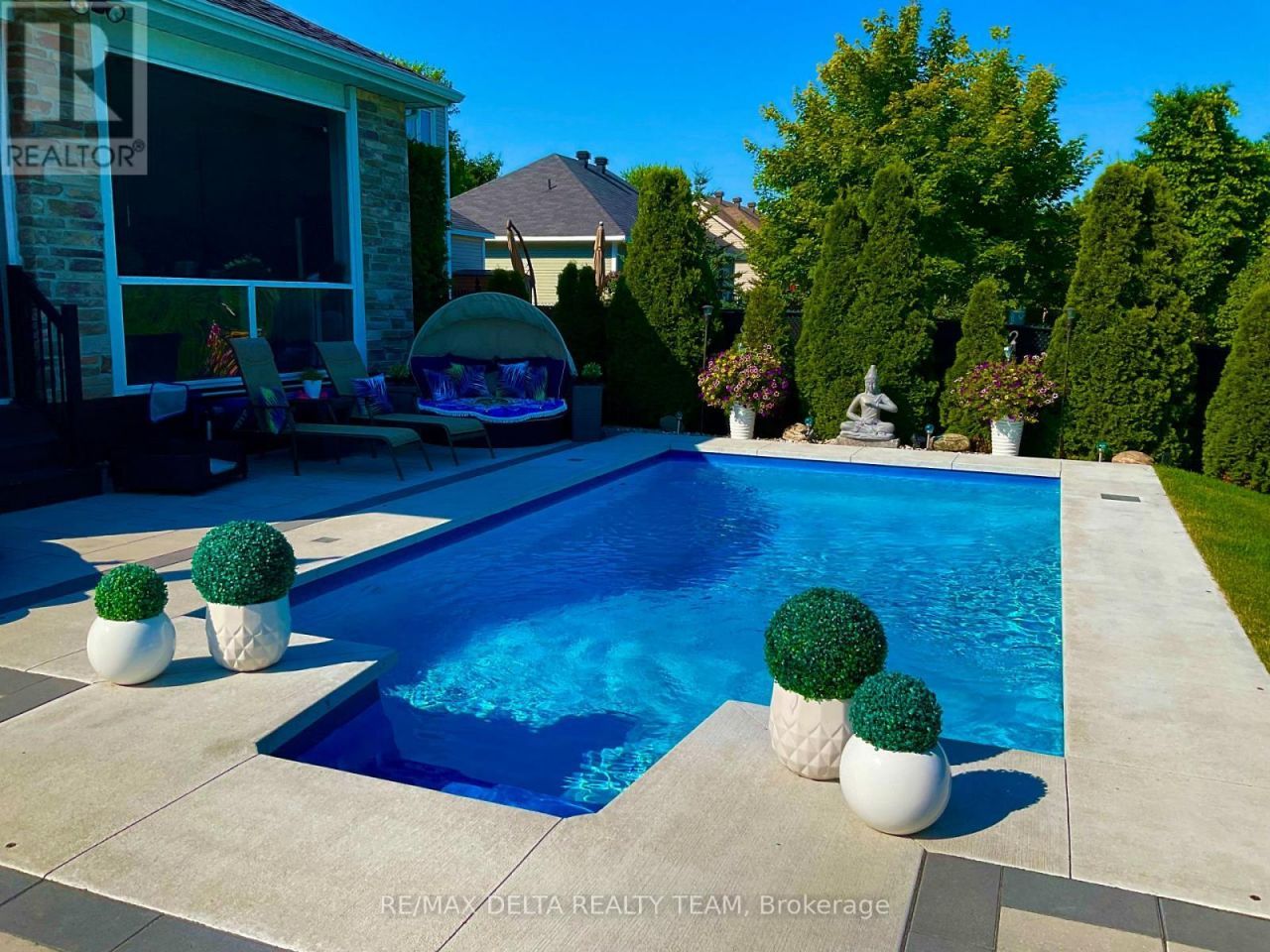 Luxurious Bungalow with 5 Bedrooms, Designer Finishes & Resort-Style Backyard Oasis! Welcome to this stunning 3+2 bedroom, 3 full bath builder model bungalow, perfectly situated with no rear neighbours and a beautifully landscaped yard, offering complete privacy and luxury living inside and out. Step into a spacious foyer and experience the bright, open-concept design where large windows fill the living and dining areas with natural light. The heart of the home is the chef-inspired kitchen showcasing High-end stainless steel appliances, Oversized granite island with extra storage, Pantry with pull-outs and valance lighting. Seamless flow into the inviting family room with cozy gas fireplace. From here, patio doors lead to your private outdoor paradise featuring a four-season bonus room complete with built-in kitchenette, Napoleon BBQ, and gas fireplace, ideal for year-round entertaining. Enjoy summer days in your heated in-ground pool or unwind in the hot tub, surrounded by lush gardens, mature trees, stylish interlock patio, and a large deck. The ultimate backyard retreat. The spacious primary suite is a true escape, boasting Updated Spa-like ensuite with glass shower & freestanding tub, Double vanity with custom cabinetry + Walk-in closet with built-in organizers. The fully finished lower level offers incredible flexibility with 3 large rooms (perfect as additional bedrooms, gym, or media room), a full bathroom, and generous storage space, all crafted with attention to detail. Premium finishes throughout including: Hardwood floors, Tile in wet areas, Crown moulding, 9ft Smooth ceilings & much more.This home is truly a rare find, blending elegant indoor living with resort-style outdoor space. Whether you're hosting guests or seeking a peaceful sanctuary, this property delivers it all. See Attached list of extra features and inclusions. (id:52350)